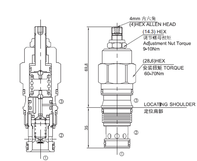 此阀为常闭压力调节阀。当进口(口①)压力达到阀设定值,阀开始向油箱(口②)