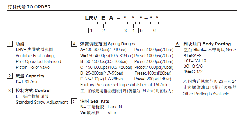E 1.7- 28 bar; Preset(预设定):14bar温度-40°F to +250°F(-40°C to +120°C)油液Mineral-based fluids with viscosities of 7.4 to 420 cSt.(矿物油粘度)阀块材料钢和球铁允许使用最大压力350bar -