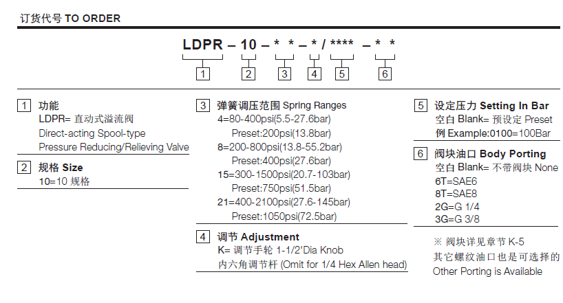 27.6 to 145 bar, preset预设定:72.5bar温度-40°F to +250°F(-40°C to +120°C)油液Mineral-based fluids with viscosities of 7.4 to 420 cSt.(矿物油粘度)阀块材料6061-T6铝,允许使用最大压力207bar 钢和球铁允许使用最大压力350bar -