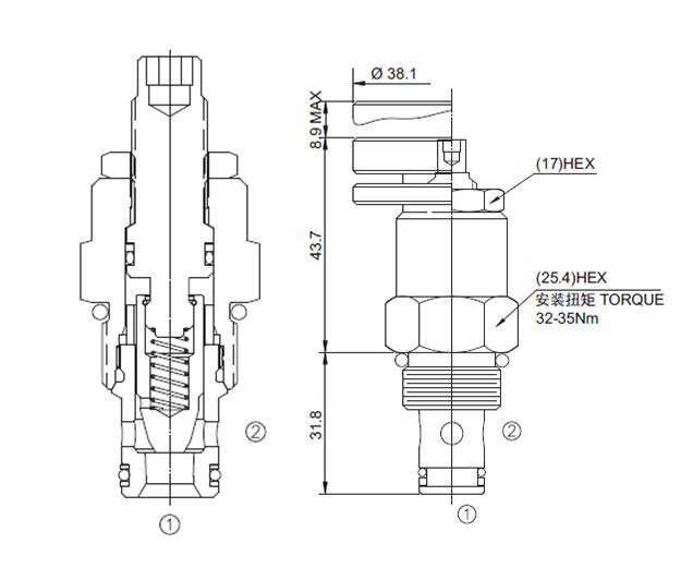节流阀流量大小可通过调节螺杆来实现。②到①节流, ①到②开启。