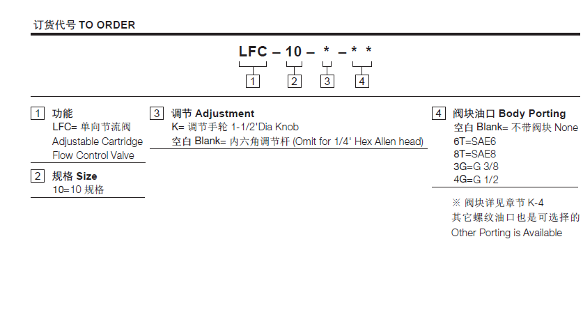流量请查看《压力-流量曲线图》插孔10-2过滤参考《油液清洁度》最大工作压力250Bar内泄漏3 drops/min(滴/分). max. at shut-off温度-40°F to +250°F(-40°C to +120°C)油液Mineral-based fluids with viscosities of 7.4 to 420 cSt.(矿物油粘度)阀块材料6061-T6铝,允许使用最大压力207bar 钢和球铁允许使用最大压力350bar -