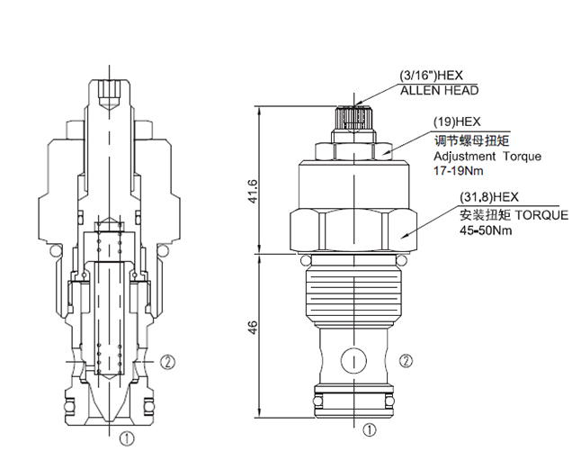 节流阀流量大小可通过调节螺杆来实现。②到①节流, ①到②开启。
