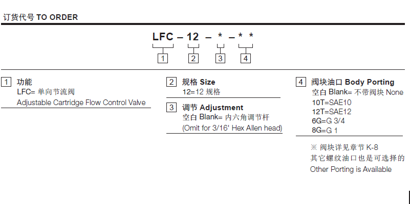 工作压力240Bar流量请查看《压力-流量曲线图》插孔12-2过滤参考《油液清洁度》内泄漏3 drops/min(滴/分) Max at 240bar.温度-40°F to +250°F(-40°C to +120°C)油液Mineral-based fluids with viscosities of 7.4 to 420 cSt.(矿物油粘度)阀块材料6061-T6铝,允许使用最大压力207bar 钢和球铁允许使用最大压力350bar -