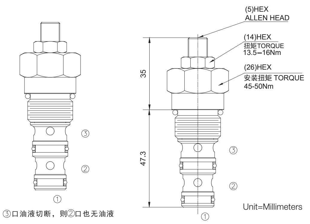 流液( ③流向① ) 不经过控制节流孔。旁路②口可作为工作口。逆时针转动手柄,调节