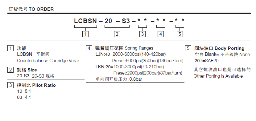 流量请查看《压力-流量曲线图》插孔20-S3过滤参考《油液清洁度》最大设定值350 bar最大负载270 bar负载保持压力350 bar单向阀开启压力0.8 bar内泄漏5 -10 drops/min(滴/分). at 80% of pressure setting(max. 40 drops/min.)控制比10=8:1; 03=4:1温度-40°F to +250°F(-40°C to +120°C)油液Mineral-based fluids with viscosities of 7.4 to 420 cSt.(矿物油粘度)阀块材料钢和球铁允许使用最大压力350Bar -