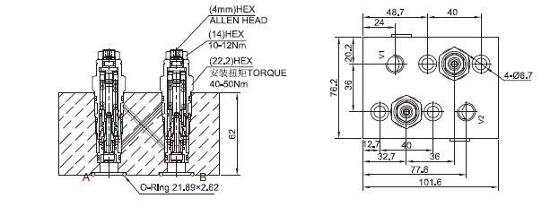 插孔SUN T-11A过滤参考《油液清洁度》阀体类型马达集成式阀组(Motor mount).接口类型丹佛斯OMP(Danfoss OMP).阀体特点对口先导(Cross pilot).油口尺寸V1,V2: 1/4" NPT.内泄漏5 drops/min(滴/分). at nominal pressure温度-40°F to +250°F(-40°C to +120°C)油液Mineral-based fluids with viscosities of 7.4 to 420 cSt.(矿物油粘度)阀块材料6061-T6铝,允许使用最大压力207bar 钢和球铁允许使用最大压力350bar -