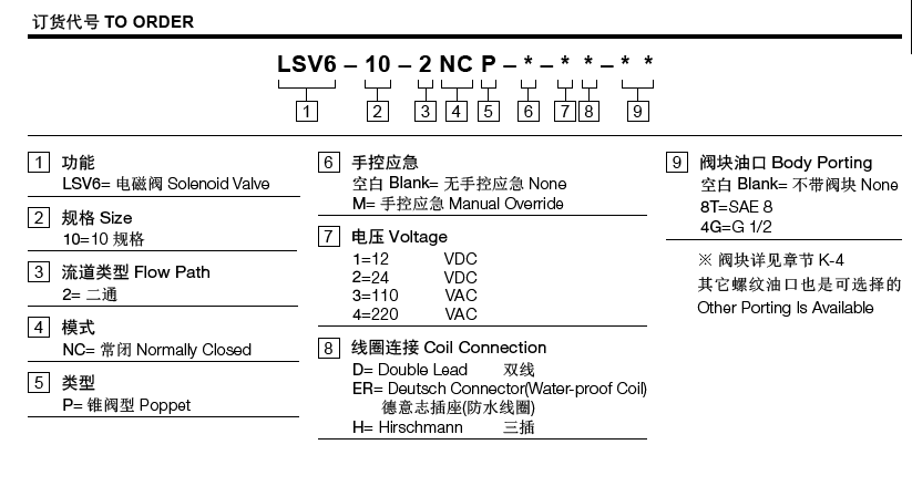 工作压力350bar流量请查看《压力-流量曲线图》插孔10-2过滤参考《油液清洁度》内泄漏3 drops/min.(滴/分)max. at 350bar温度-40°F to +212°F(-40°C to +100°C)线圈额定负载Continuous from 85% to 115% of nominal voltage(连续工作电压)油液Mineral-based fluids with viscosities of 7.4 to 420 cSt.(矿物油粘度)阀块材料钢和球铁允许使用最大压力350bar -