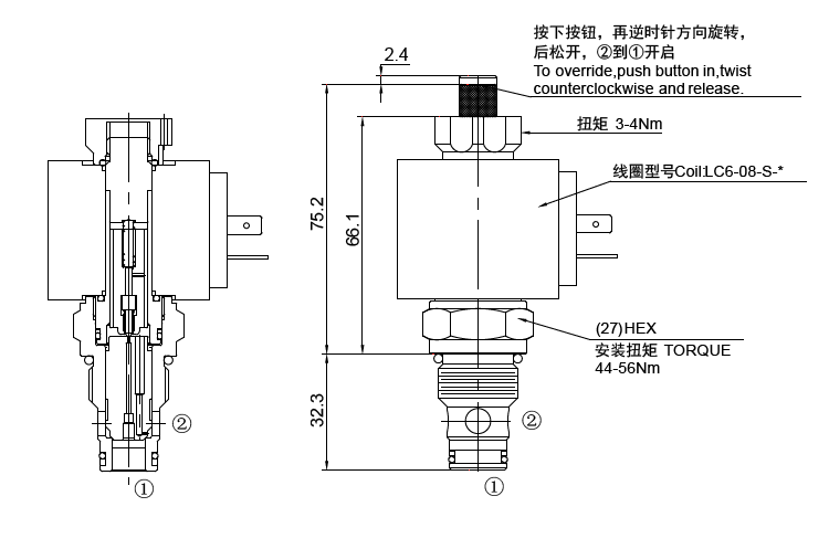 失电时,①到②相当于单向阀,②到①关闭;