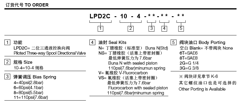 采用7.6bar弹簧(for 7.6bar spring): 8.6bar温度-40ºF to +250ºF(-40ºC to +120ºC)油液Mineral-based fluids with viscosities of 7.4 to 420 cSt.(矿物油粘度)阀块材料6061-T6铝,允许使用最大压力207bar 钢和球铁允许使用最大压力350bar -