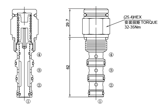 在初始位置(无液控)时,此阀允许油液从③到②双向流动,④口不通。此阀弹簧腔通