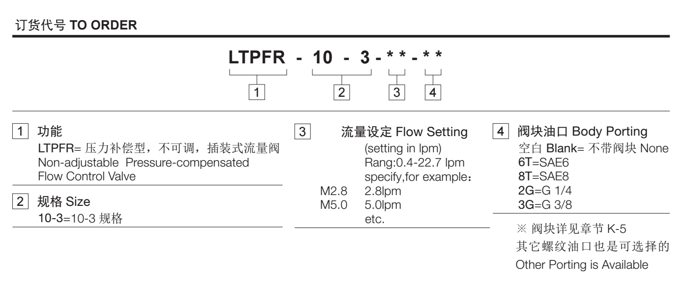 工作压力240bar流量请查看《压力-流量曲线图》插孔10-3过滤参考《油液清洁度》流量选项0.4-22.7 lpm流量控制精度0.4 to 5.9 l/min. setting ±15%