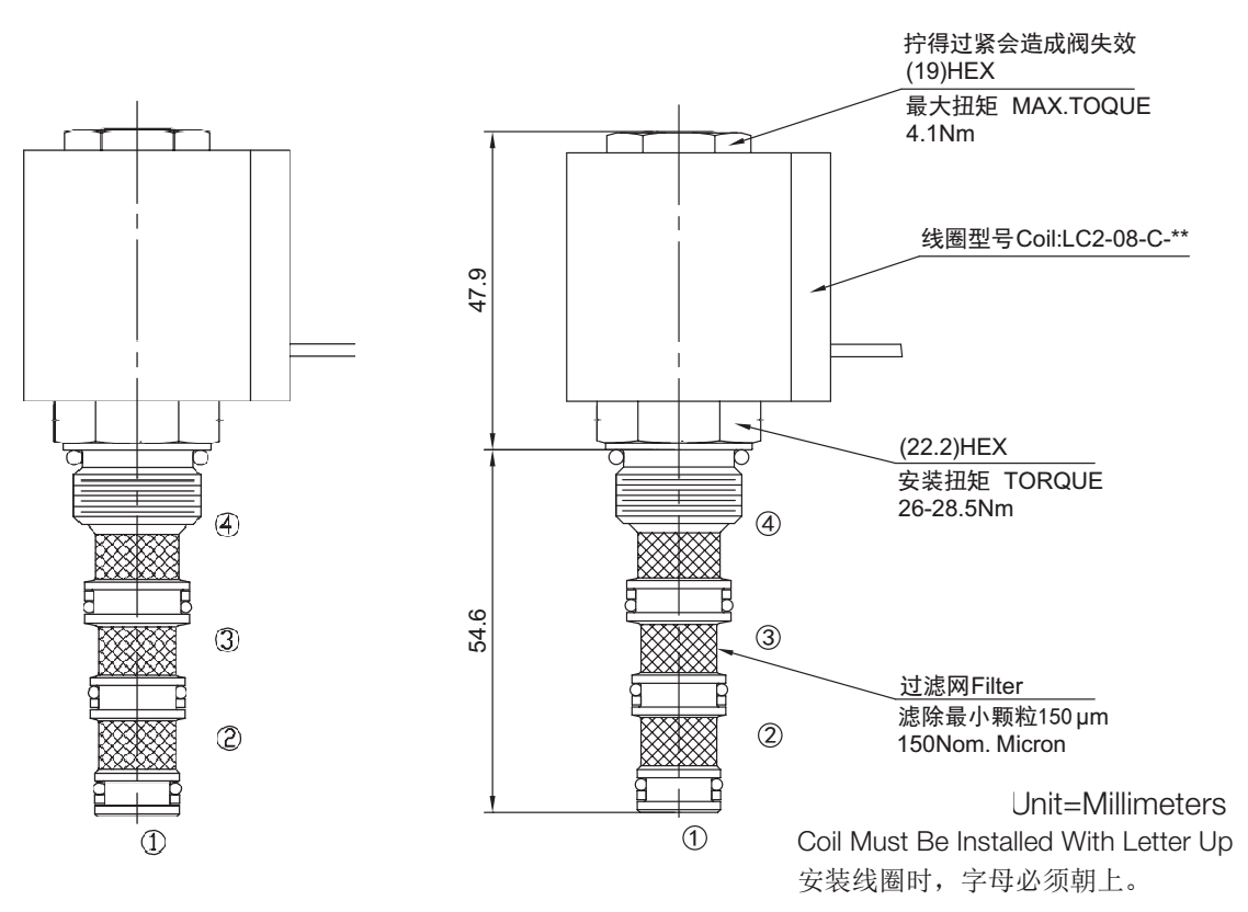工作压力207Bar流量请查看《压力-流量曲线图》插孔08-4过滤参考《油液清洁度》内泄漏82 cc/min.(毫升/分) max. at 207bar温度-40ºF to +212ºF(-40ºC to +100ºC)线圈额定负载Continuous from 85% to 115% of nominal voltage(连续工作电压)油液Mineral-based fluids with viscosities of 7.4 to 420 cSt.(矿物油粘度)阀块材料6061-T6铝,允许使用最大压力207Bar 钢和球铁允许使用最大压力350Bar -