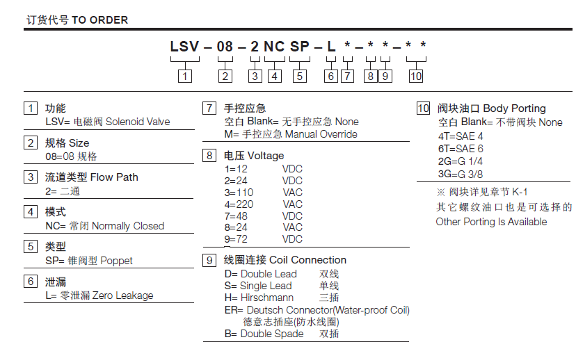工作压力250Bar流量请查看《压力-流量曲线图》插孔08-2过滤参考《油液清洁度》内泄漏<1 drops/min.(滴/分)Our ideal leakage: <0.05 drops/min温度-40°F to +212°F(-40°C to +100°C)线圈额定负载Continuous from 85% to 115% of nominal voltage(连续工作电压)油液Mineral-based fluids with viscosities of 7.4 to 420 cSt.(矿物油粘度)阀块材料6061-T6铝,允许使用最大压力207bar 钢和球铁允许使用最大压力350bar -