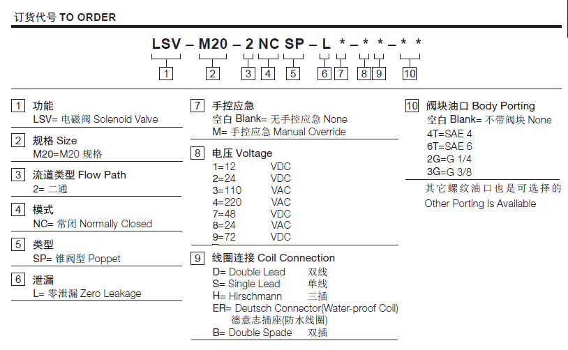 工作压力250Bar流量请查看《压力-流量曲线图》插孔HYDAC 06020过滤参考《油液清洁度》内泄漏<1 drops/min.(滴/分)Our ideal leakage: <0.05 drops/min温度-40°F to +212°F(-40°C to +100°C)线圈额定负载Continuous from 85% to 115% of nominal voltage(连续工作电压)油液Mineral-based fluids with viscosities of 7.4 to 420 cSt.(矿物油粘度)阀块材料6061-T6铝,允许使用最大压力207bar 钢和球铁允许使用最大压力350bar -